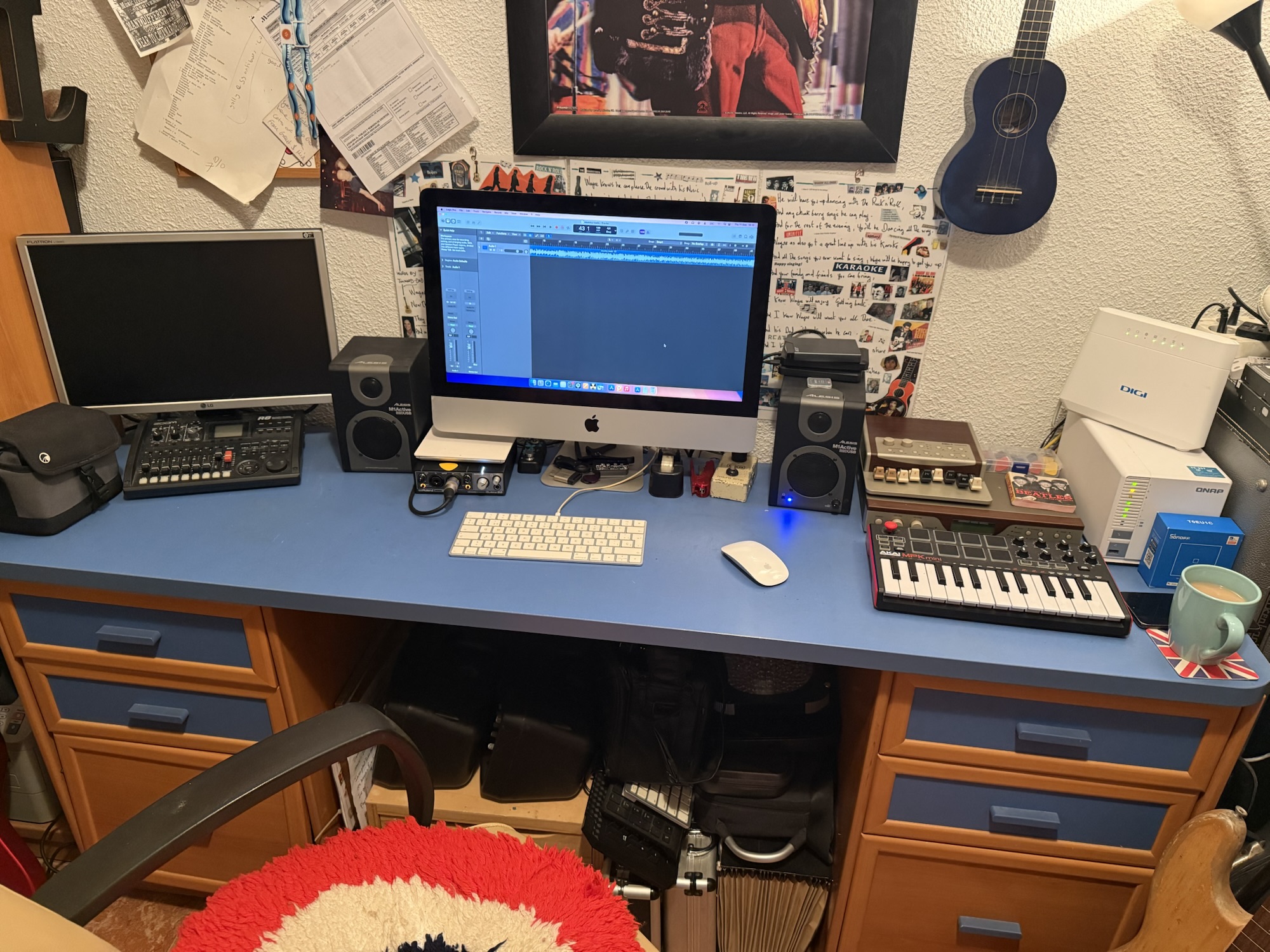 Watch for album postings and phase two with the drums and keys! Plus im going to clear under the desk and get some stands for the studio monitors…